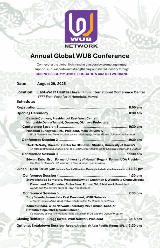 Most importantly, your presence matters. Your voice, your story, and your participation are essential to building the renewed WUB Hawaii chapter. We encourage you to attend meetings, share ideas, talk story, reconnect with old friends, and make new ones. Together, we will continue the proud legacy of our Uchinanchu ancestors while creating opportunities for the next generation.